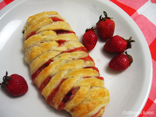 одмрзнатото лиснато тесто, посипано од брашно од двете страни, исукајте го на дебелина од околу 3 mm и исечете го на 6 дела со димензии отприлика 10 x 17 cm. исечете ги лентите како на сликите и наредете ги парчињата на подмачкано тавче или врз хартија за печење. ставете по 1 голема лажица (или малку повеќе) од кремот во средината на секое парче тесто, врз него ставете поприлична количина јагоди, па свиткајте ги лентите од тестото врз јагодите, една по една, наизменично, од едната и од другата страна и притиснете ги малку да се залепат. премачкајте ги погачиците со белката и печете ги во загреана рерна на 200°C околу 25-30 минути или додека тестото не е добро испечено. многу убаво мириса додека се печат.